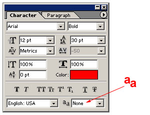 Anything you draw within these Magenta area's, make sure the edges have NO Anti-Aliasing. That is, the edges are not faded in anyway. Fading the edges will allow bits of magenta to bleed through, round the edges of the marking. So in the case of an Image, make sure the edges are not blurred or anti-aliased in any way. In the case of a font, ensure that the 'aa' is set to 'None', as seen in the image. Else what will happen is, when the font is rendered, the edges of the font will be Anti-Aliased (normally this would result in a smoother, better looking letter) and let the Magenta colour beneath bleed through round the edges. This will prevent that.