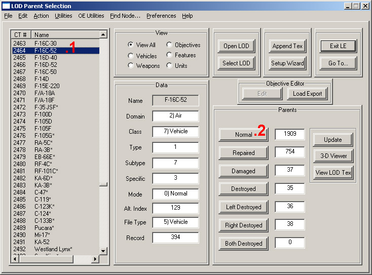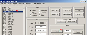 Once you have LOD Editor on your PC, start it up, and find the object you wish to skin from the list of objects on the left hand side. Our example, the F-16CJ-52 is 2462 in the list. Click on the object (1). Now on the right hand side of the main LE window, you'll see a section titled 'Parents'. Inside this section we need to click on the [Normal] button (2), which will open a new window titled 'LOD Parent Data'.