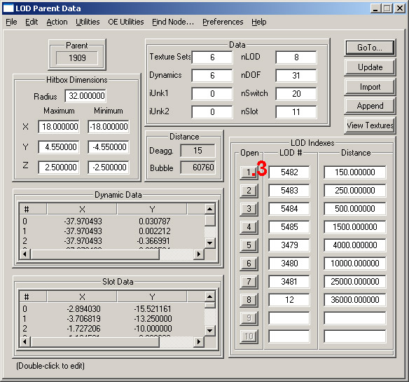 Again we look to lower right hand side to the 'LOD Indexes' section, where we click on the [1] button (3), to again open a new window, this time called 'LOD Data'.