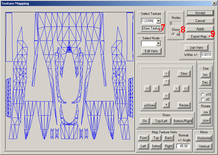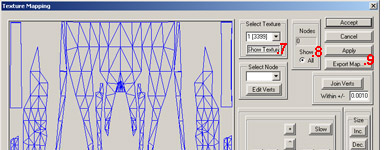 Now we are at the 'Texture Mapping' screen. Again to the right, below the first drop down, click on [Hide Texture], (7) then just to the right again, check the Nodes Show All (8) option. Back to the Select Texture drop down, we now work thru each texture, clicking on the texture number in the drop down, then on the [Export Map] (9) button, giving the texture a file name (which should just be the texture number, followed by .bmp), and then choosing to save at either 512×512 or 1024×1024.