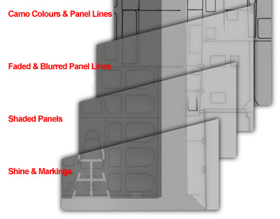As you can see in the above image, fitting the Panel Lines, and setting the Layer Type to Multiply, will produce what we see above, as labelled Camo Colours & Panel Lines. First thing i normally do once i have fitted the panel lines and start weathering is to make a copy of the panel lines, then using Filter → Blur → Gaussian Blur (and a setting between 7-20), blurr these panel lines. The reduce their Opacity (the Opacity control is next to the Layer Type control, explained above) to around 40% or a setting where you dont instantly notice them. Then the original panel line layers will have their opacity reduced to about 20%. Your skin will now resemble the second layer, labelled Faded & Blurred Panel Lines. Save your files as BMP and view in LE Model Viewer, and you will instantly noticed the effect.
