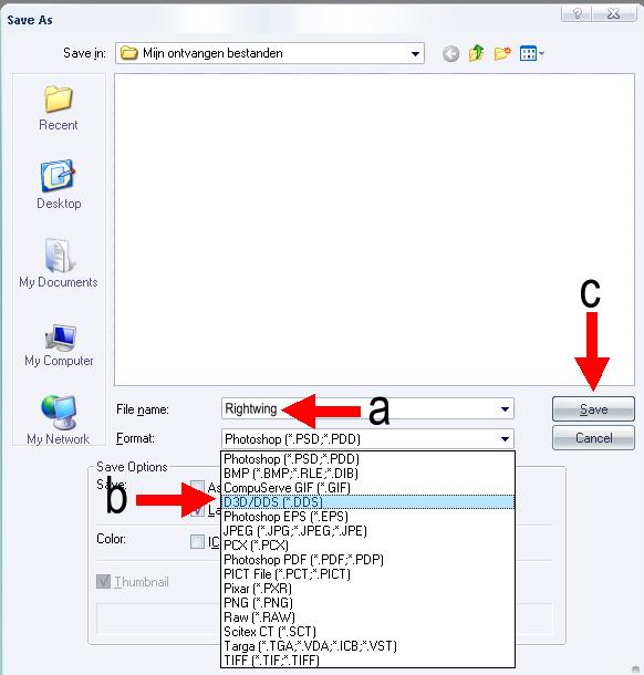 Next you have to select the output quality of the dds file. I normaly use the DXT1 with alpha option. That'll keep it nice and not to large. Remember DXT1 no alpha is low quality and DXT5 which is high quality but makes the skinfile large. Larger means more videocard memory use and more rendering time. (For my cloud skin files I used DXT5).